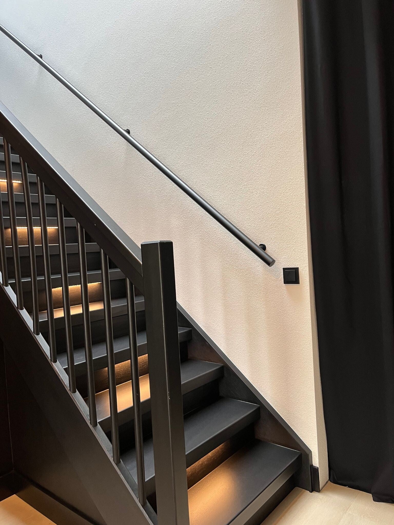 Een stijlvol zwart stootbord met een moderne, diepzwarte uitstraling. Deze kleur voegt een krachtig en elegant accent toe aan elke trap. Het oppervlak benadrukt een luxe, eigentijdse look. Perfect te combineren met lichte tredes of hout details voor een contrastrijk en modern interieur.